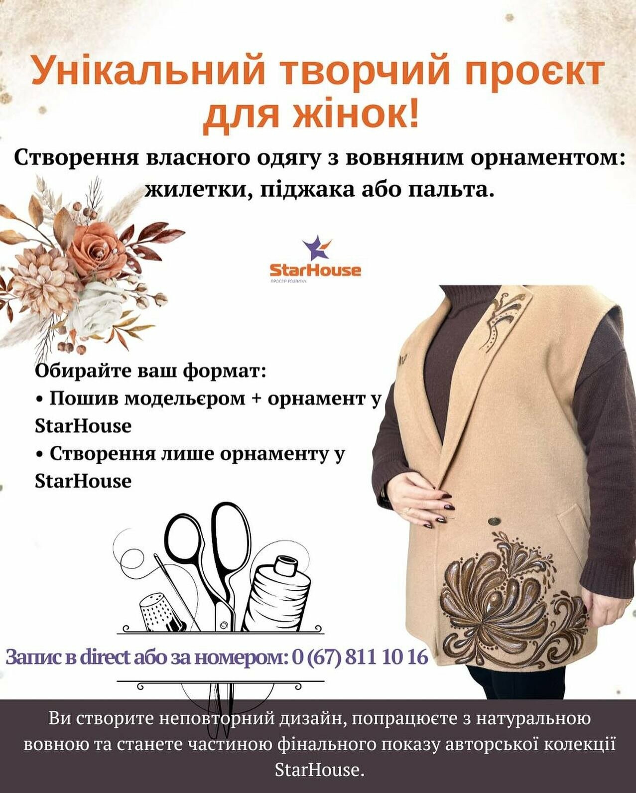 Варіант "Лише орнамент у StarHouse". Цей варіант для тих, хто: має свою тканину, хоче самостійно кроїти або шити або працює зі своїм майстром. Ви приходите створити власний орнамент із вовни на деталях вашого виробу. Вартість: 800 грн (вовна + майстер-клас у StarHouse).